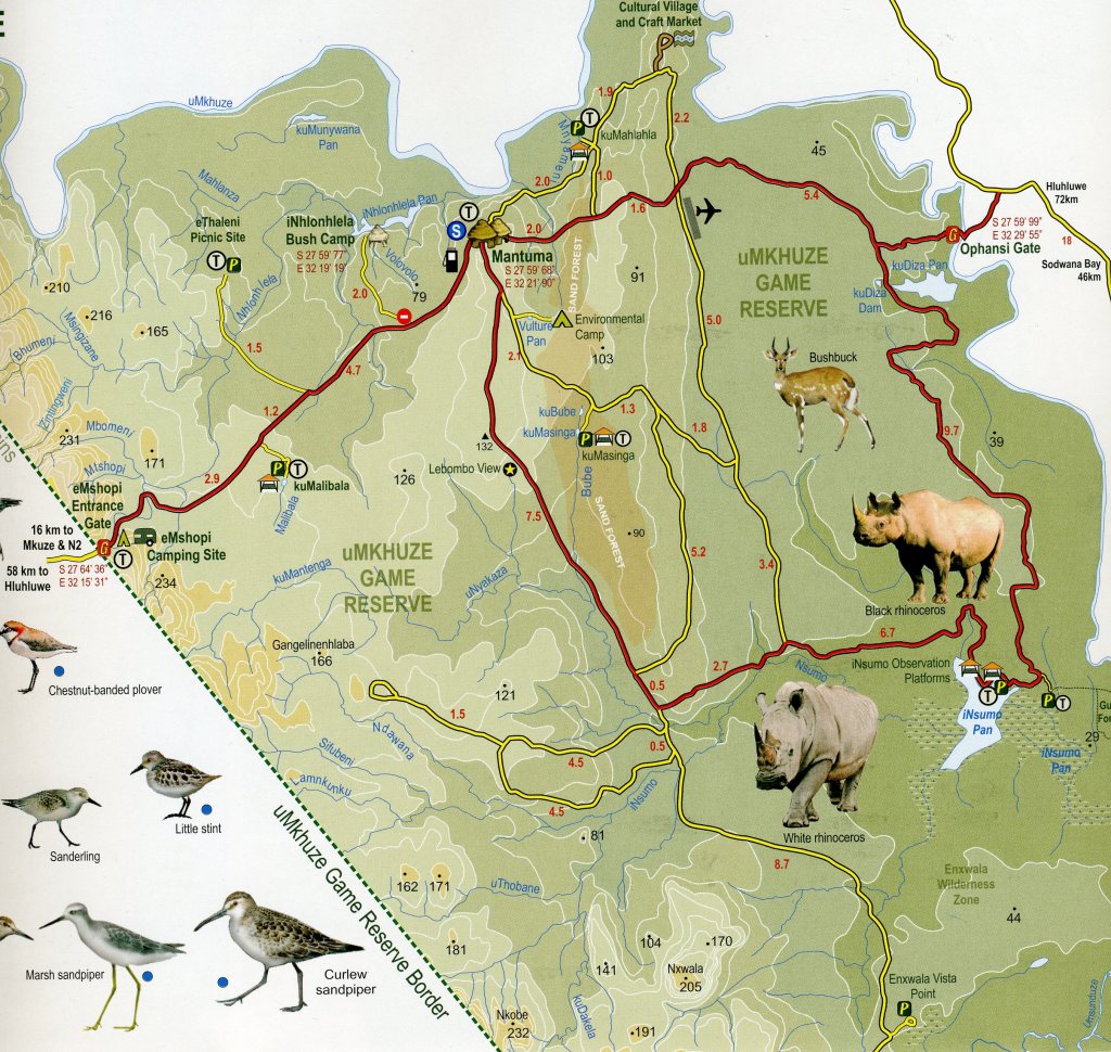 This diversity of habitats means a wide variety of animal species including black and white rhinoceros, elephant, giraffe, nyala, blue wildebeest, warthog, eland, hippo, impala, kudu and other smaller antelope.