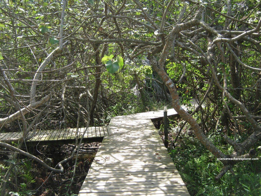 In the distance, you can see Lagoon Hibiscus Malraceae hibiscus tilaceus. It is a large, stout, open-branched shrub or small tree with spreading branches. It grows to a height of 3-6 m. Stems long and flexible. Large dark green simple leaves are heart-shaped to almost circular, or broader than long, 30-150 mm in diameter or larger; 5- to 9-veined from the base, veins prominent, each of the main veins with a slit or elongated gland near the base.