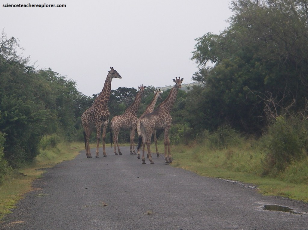 Pictured above, A group of Giraffes Giraffe camelopardalis on the road after a rainstorm that are unmistakable with its long legs and neck. The brown patches on the male’s body darken with age. Both sexes have two short horns. They form herds, but individuals wander between herds.