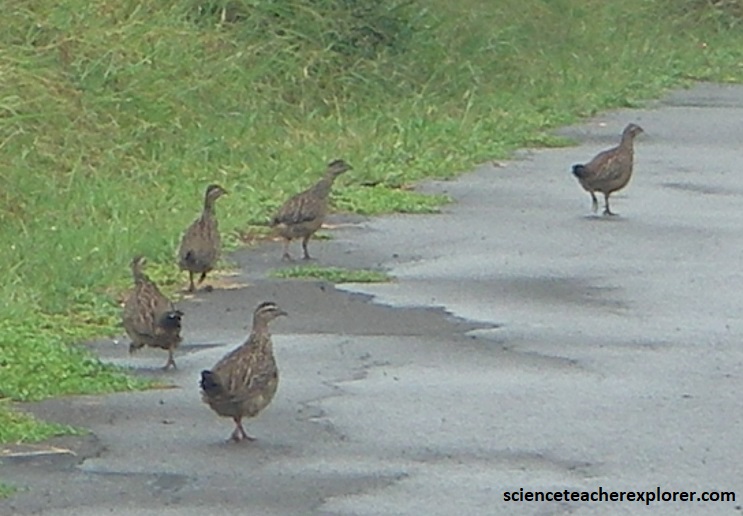 Pictured above, is a flock of Coqui Francolin Peiperdix coqui on the road near the Mantuma Camp. The male has a golden brown head and neck with a darker crown. The female has white eyebrows, and a white throat, outlined in black. Both sexes have heavily barred black and white bellies. A secretive bird with a crouched walk.