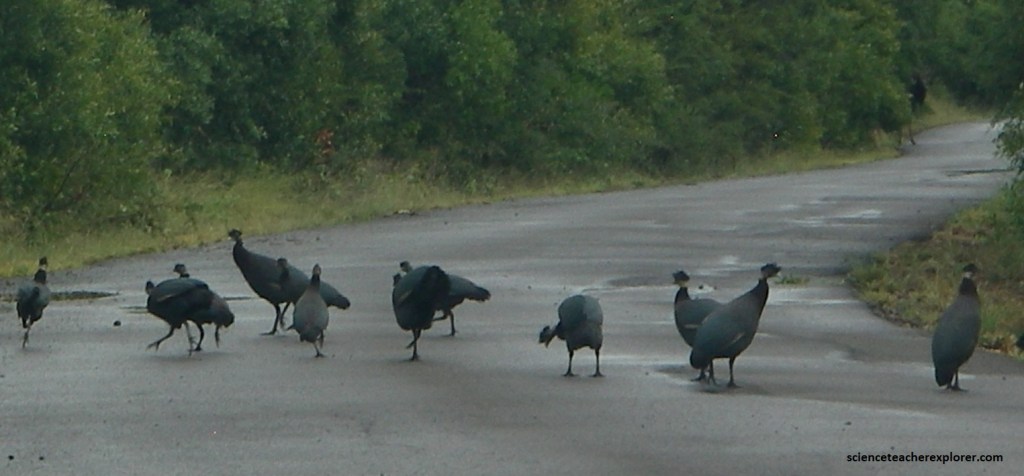 Pictured above, is a herd of Crested Guineafowl Guttera edouardi on the road near the Bube River. The curly black feathers on the crown distinguish it from the Helmeted Guineafowl. It has red eyes, and a black neck and body with white spots. They seem to prefer very dense vegetation and is therefore confined to the Pafuri area.