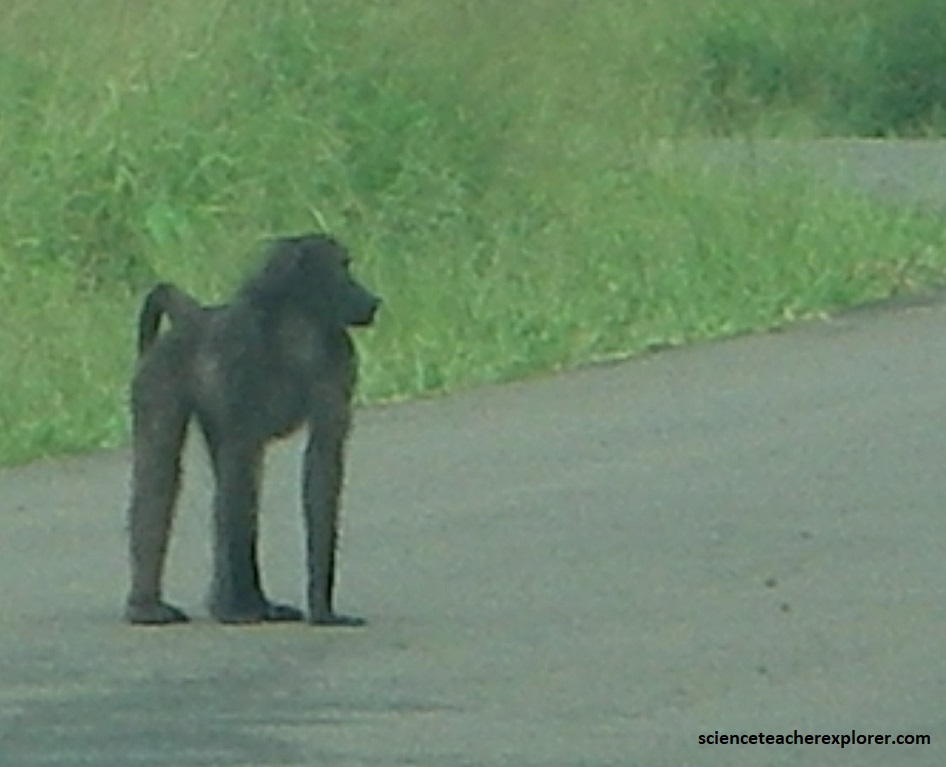 Pictured above, the Chacma Baboon Papio ursinus on the road has an elongated face, long legs and tail. They usually live in troops that have a distinct hierarchy. The male is larger and more aggressive than the female. Omnivorous.