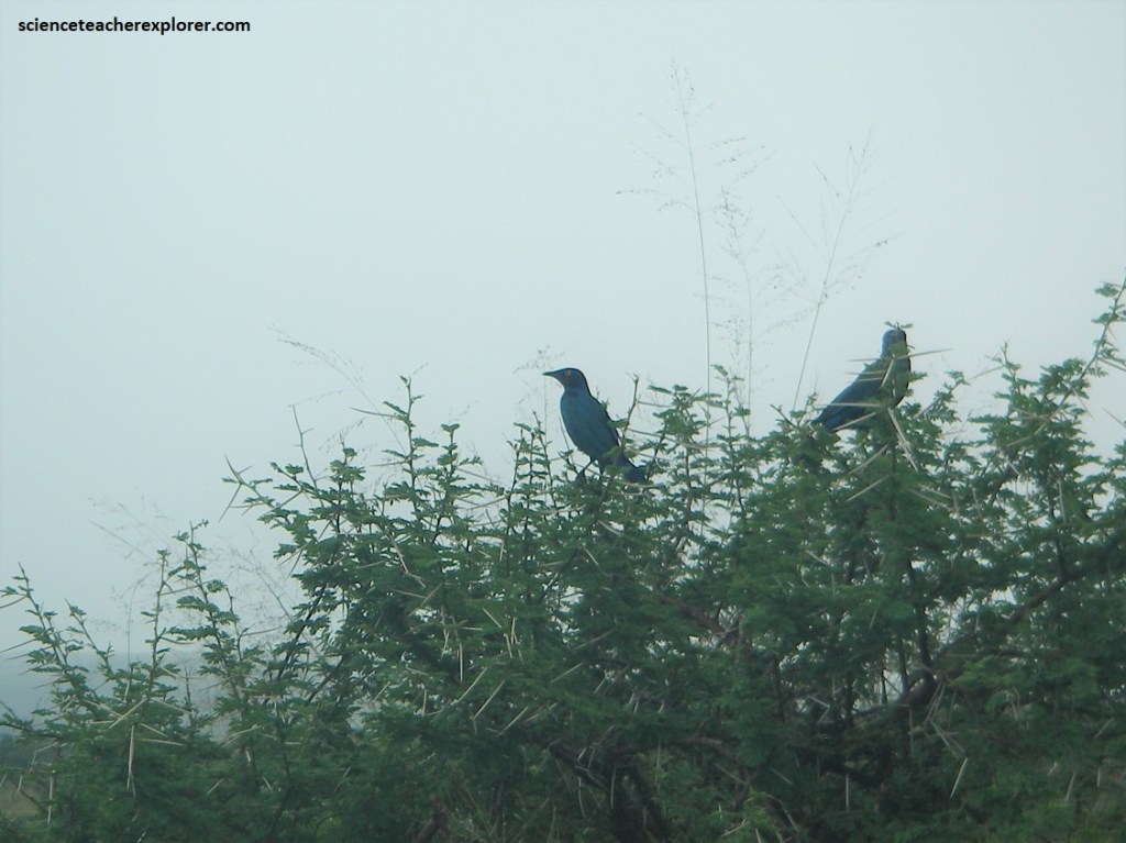 Pictured above, a couple of Greater Blue-eared Starlings Lamprotornis chalybaeus are found near the road at the Mantuma Camp. The dark ear patches behind the eyes and royal blue on the belly and flanks, distinguishes it from the Cape Glossy Starling. On the upper wings are two rows of dark spots.