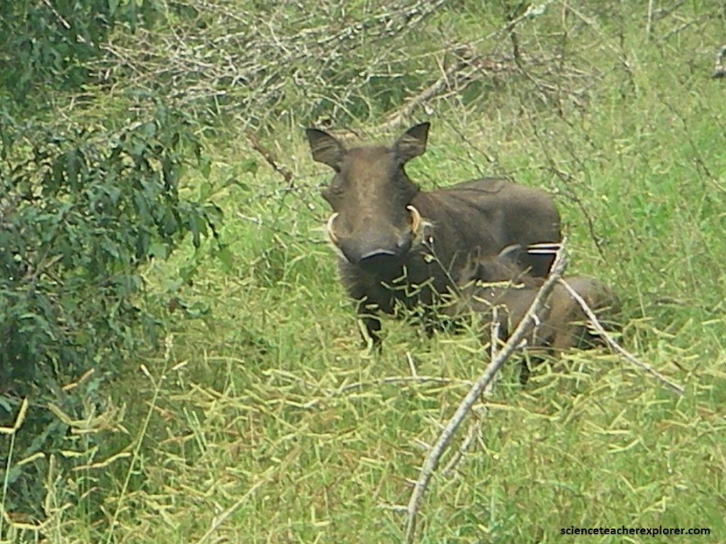 Pictured above, the Common Warthog Phacochoerus africanus is grey with little body hair. The males have longer canine teeth and two pairs of warts. The tail is held up while running. They live in family groups and graze while standing or kneeling. Grunting and squealing are the most common vocalization.