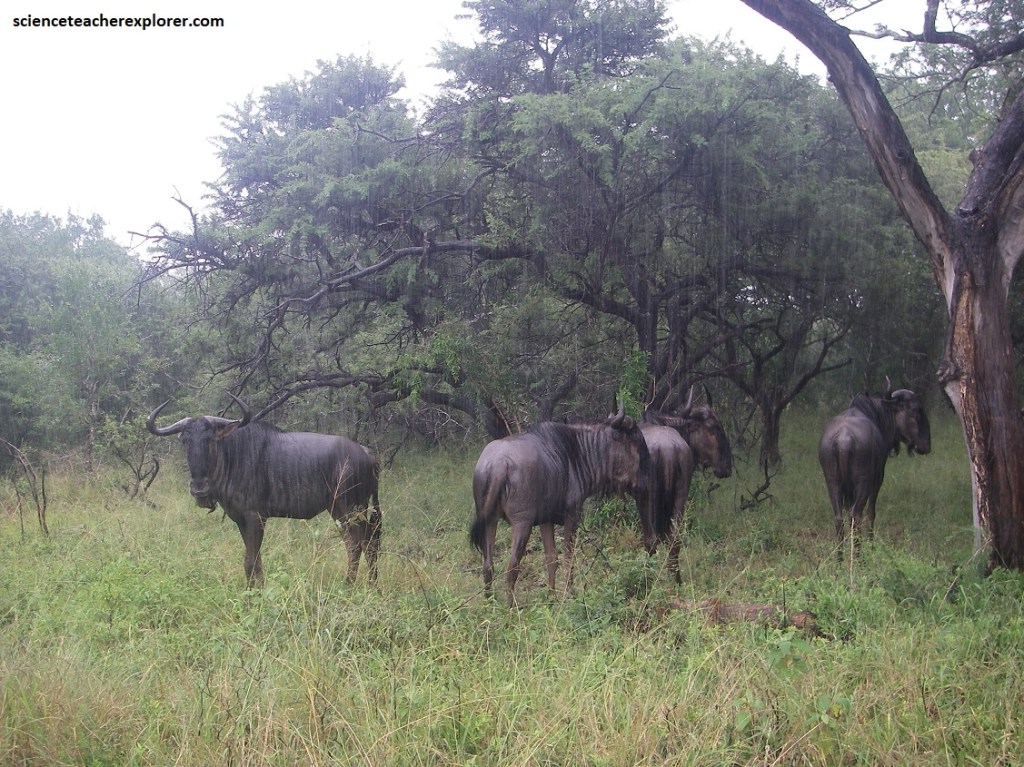Pictured above, a herd of Blue Wildebeest Connochaetes taurinus appeared in a brief rainstorm. We noticed that the animals seems to gravitate to the road when it rains. These blue-grey cattle-like animals had dark vertical stripes on the neck and tail. Bothe sexes have horns, but the males are larger.